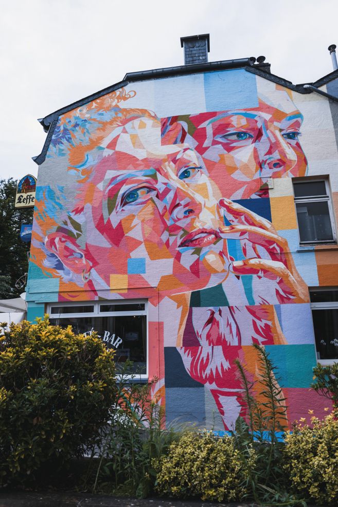 Dourone und Elodieloll haben dieses Wandgemälde im Jahr 2021 als Teil der Space-Time Collection fertiggestellt. Das Wandgemälde zeigt zwei Bilder des Models Nya, die im Abstand von 2 Sekunden aufgenommen wurden. Durch die Verwendung von Pixeln, um die Bewegung darzustellen, regen die Künstler dazu an, über die Begriffe Zeit und Geschwindigkeit nachzudenken.